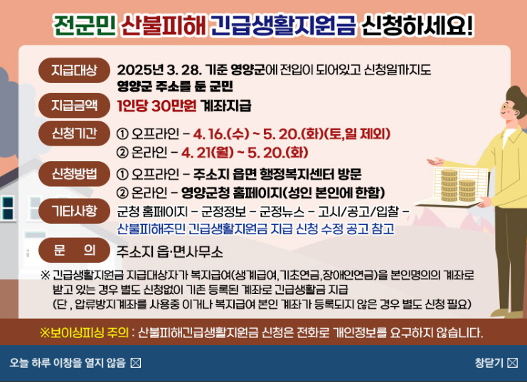혹시 영양군 재난지원금 신청하셨나요? 이번에 산불피해를 입은 주민들을 위해 영양군이 지급하는 긴급생활지원금의 신청 방식이 대폭 간소화되었다는 사실, 알고 계셨나요?💡